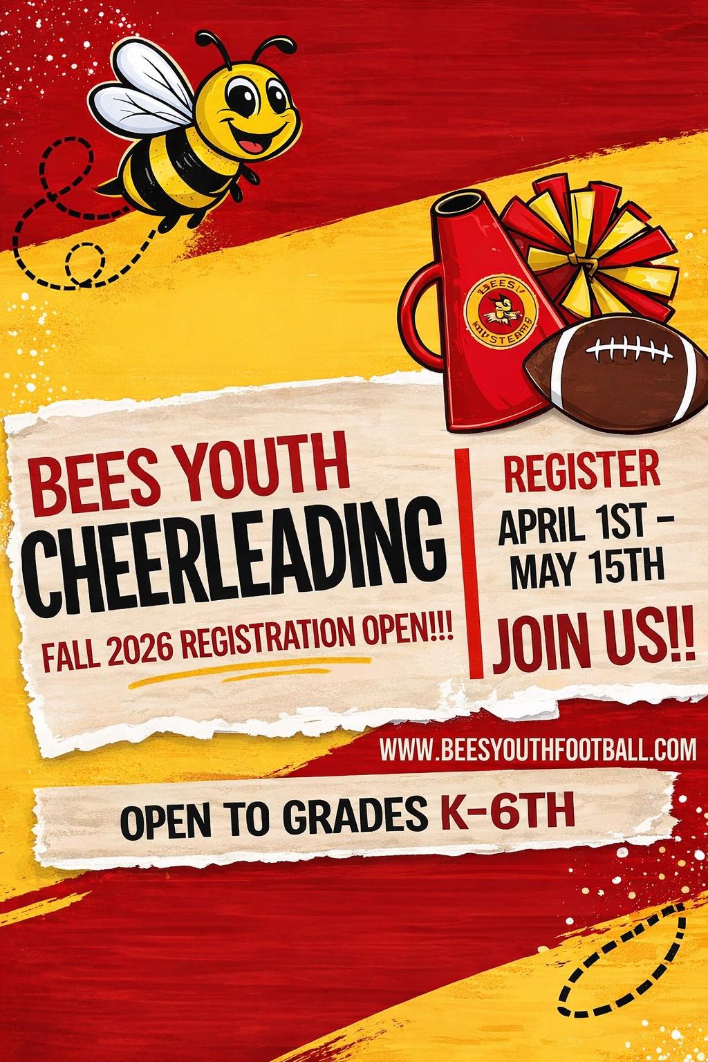 Sideline Cheerleading Bees Youth Football Fall Season (Grades K-6) and is open starting April 1st 2026 to girls and boys who live in the BBH school district. Please remember to sign up on time, as the registration deadline is strictly enforced and will close on midnight May 15th 2026.